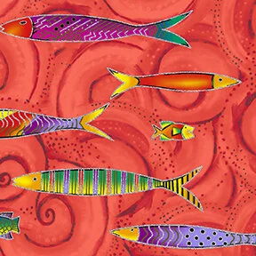 Laurel Burch Sea Goddess Orange Elongated Fish Metallic by Clothworks